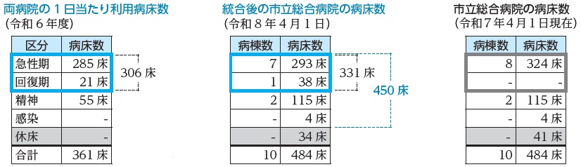 両病院の令和6年度1日当たりの利用病床数(患者数)をベースに、患者の受け入れに必要な稼働病床数を450床(休床34床)とします。