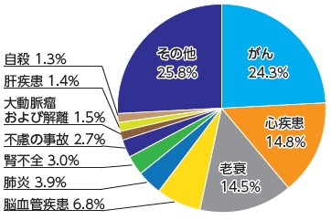 日本人男性の3人に2人が、女性の2人に1人が、がんになっています。令和6年には4人に1人ががんで亡くなっており、死因の第1位です。日本人におけるがんの要因は、男性の43.4パーセント、女性の25.3パーセントが生活習慣や感染であるといわれています。