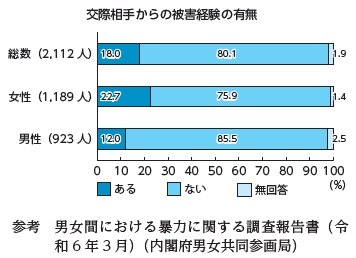 国の調査によると、女性の約5人に1人、男性の約10人に1人が交際相手から暴力を受けていると回答しています。