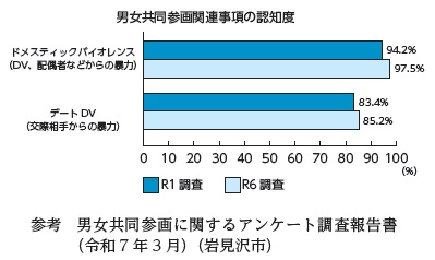 市は、第3次いわみざわ男女共同参画実践プランを策定し、さまざまな施策を推進しています。令和6年度に実施したアンケート調査の結果、DVは97・55パーセント、デートDVは85・2パーセントが〝内容まで知っている〟〝見聞きしたことはある〟と回答しています。令和元年調査と比較すると、さらに認知度が高まっていることが分かりました。