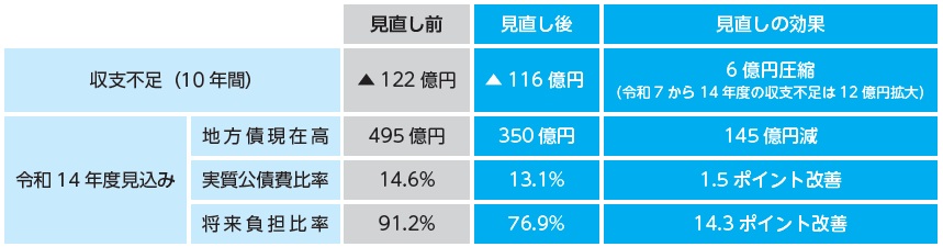 今回の改訂により、収支不足額や地方債現在高などの改善が期待されますが、依然として大幅な収支不足が見込まれます。そのため、今後も収支バランスの改善と将来の財政負担の軽減に向けて、財源の確保や歳出の見直しに取り組みます。