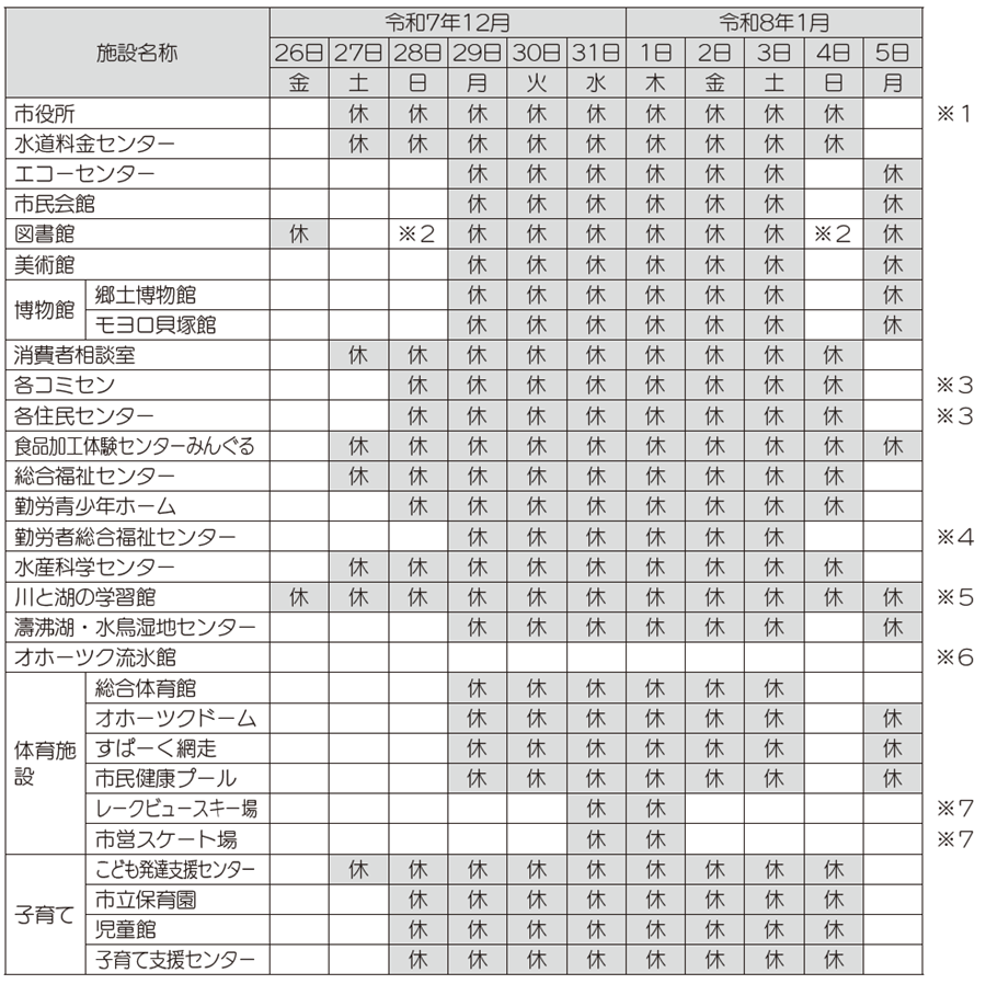※6 「オホーツク流氷館」の12月29日〜1月5日の営業時間は午前10時〜午後3時までです。