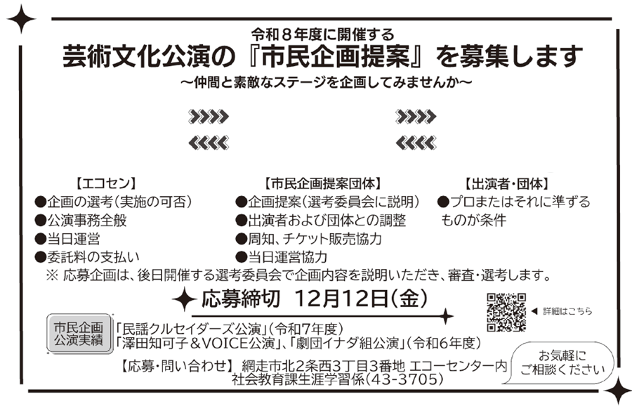 イベント 芸術文化公演の『市民企画提案』を募集します 7/43 前の記事 次の記事 発行日 : 2025年10月01日 自治体名 : 北海道網走市 広報紙名 : 広報あばしり 2025年10月号 Tweet シェアする 令和7年国勢調査のお知らせ 見つめてみよう暮らしと環境 第42回みんなの生活展
