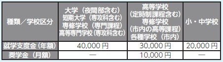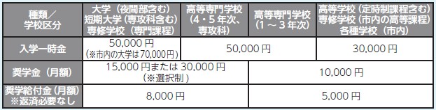 対象:下表の学校に進学予定(奨学金は在学中の方も対象)であり、保護者かこれに代わる方が市民であること