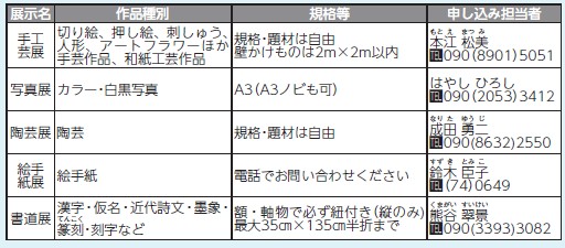 ※下表以外でも作品展示が可能な場合があります。生涯学習課にお問い合わせください