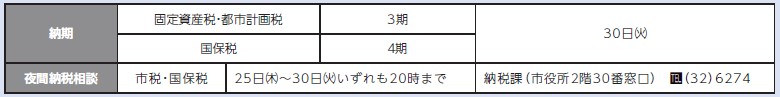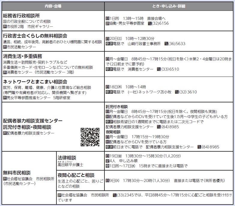 くらし 今月の市からのお知らせ―相談― 21/32 前の記事 次の記事 発行日 : 2025年09月01日 自治体名 : 北海道苫小牧市 広報紙名 : 広報とまこまい 令和7年9月号 ◎掲載内容が変更になる場合があります ■9月の無料相談 ■今月の納期・夜間納税相談 支払いの際は、便利な口座振替やコンビニ納付、スマートフォン決済アプリをご利用ください Tweet シェアする 今月の市からのお知らせ―募集― 水道窓口課(市役所3階フロア内)の窓口業務などが民間委託になります