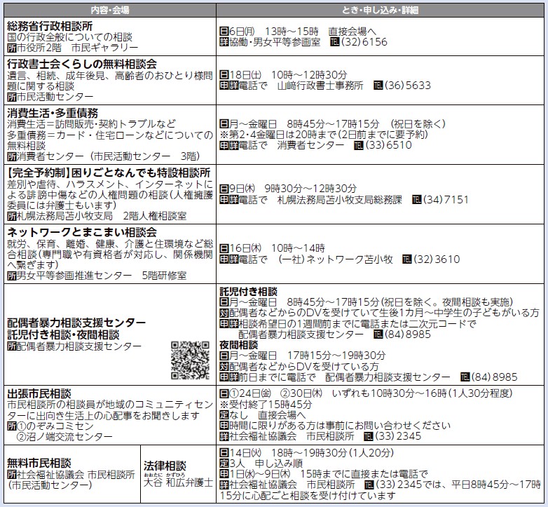 くらし 今月の市からのお知らせ―相談― 26/33 前の記事 次の記事 発行日 : 2025年10月01日 自治体名 : 北海道苫小牧市 広報紙名 : 広報とまこまい 令和7年10月号 ◎掲載内容が変更になる場合があります ■10月の無料相談 ■今月の納期・夜間納税相談 支払いの際は、便利な口座振替やコンビニ納付、スマートフォン決済アプリをご利用ください Tweet シェアする 今月の市からのお知らせ―募集― 高齢者を対象としたインフルエンザ・新型コロナウイルス感染症予防接種