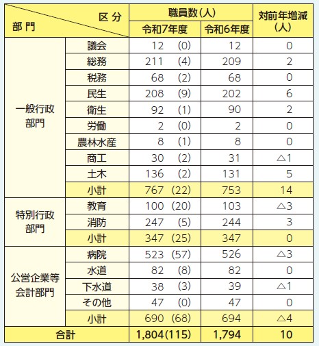 職員の定数は「苫小牧市職員定数条例」で定められています。令和7年4月1日現在の職員数は1,804人で、令和6年4月1日より10人増となっています。