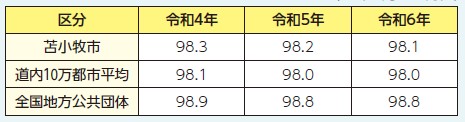 ラスパイレス指数とは、国家公務員の給与水準を100とした場合における地方自治体職員の給与水準を示したものです。本市は、令和6年4月現在98.1であり、令和5年度から0.1ポイント減となっています。下表は全国、道内の市との比較です。