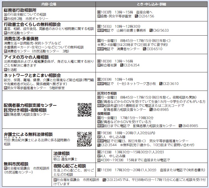 くらし 今月の市からのお知らせ―相談― 23/34 前の記事 次の記事 発行日 : 2025年11月01日 自治体名 : 北海道苫小牧市 広報紙名 : 広報とまこまい 令和7年11月号 ◎掲載内容が変更になる場合があります ■11月の無料相談 ■今月の納期・夜間納税相談 支払いの際は、便利な口座振替やコンビニ納付、スマートフォン決済アプリをご利用ください Tweet シェアする 今月の市からのお知らせ―募集― タレント・ファッションモデルアイヴァンさんが苫小牧にやってくるLGBT理解増進講演会