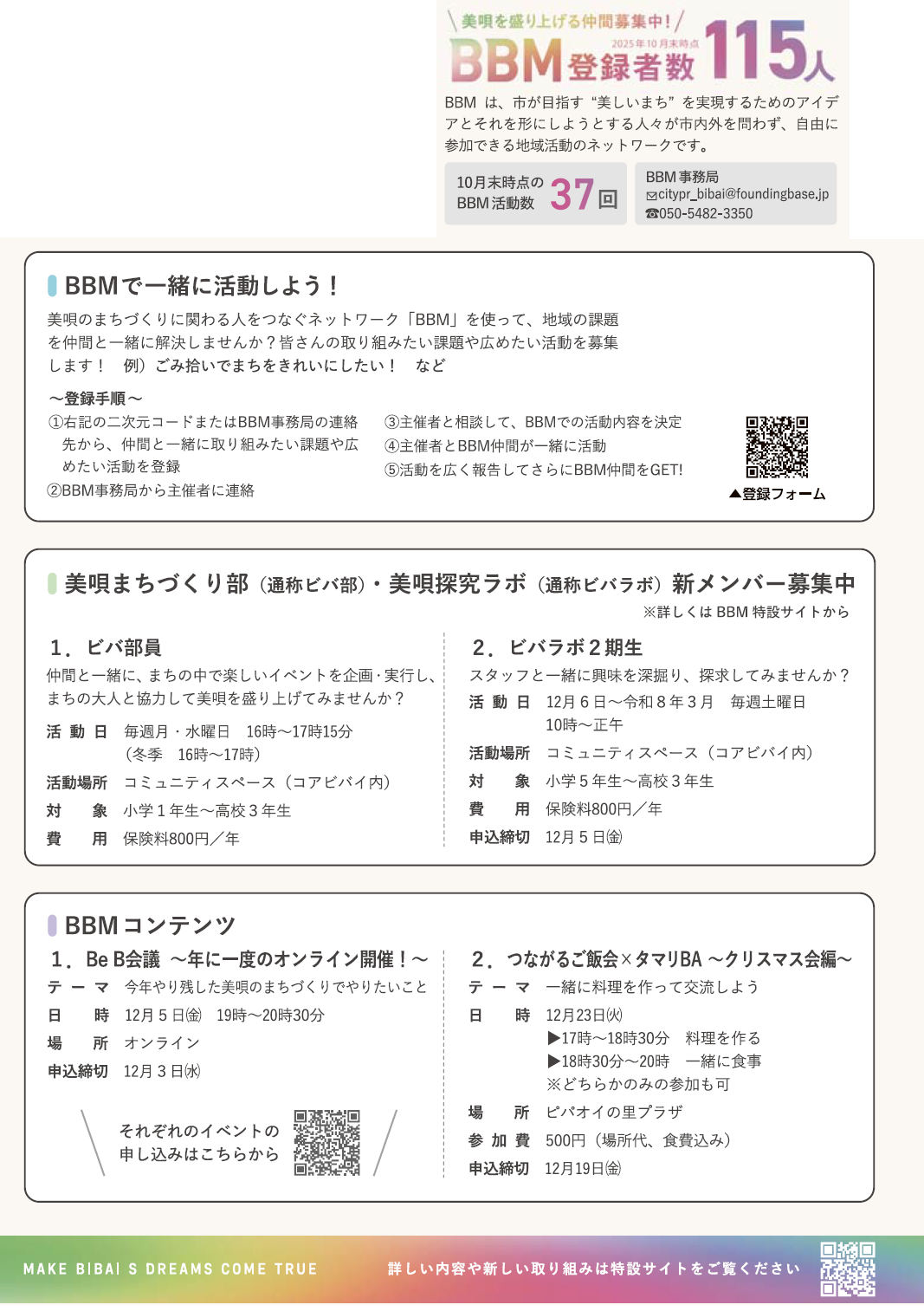 くらし 美唄シティプロモーション推進事業 BBM通信 12/45 前の記事 次の記事 発行日 : 2025年12月01日 自治体名 : 北海道美唄市 広報紙名 : 美唄市広報「広報メロディー」 2025年12月号 ~Bibai Beautiful Movement~ Tweet シェアする 地域に寄り添う「東明ステーション」へようこそ! 美唄の魅力を定期的に発信している公式YouTubeをご存じですか?