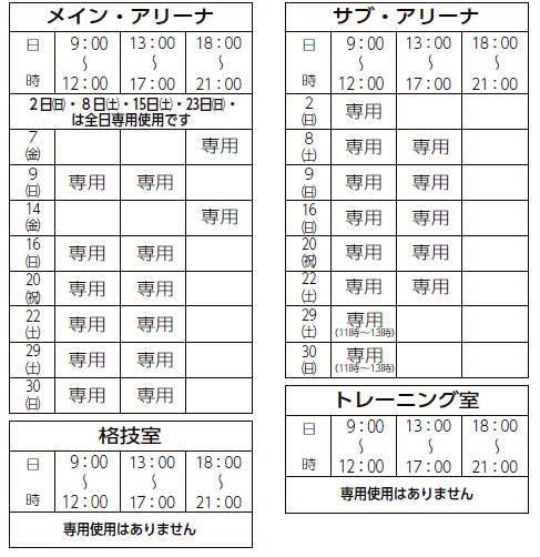 ※予定後に専用使用が入る場合、または取り消される場合がありますのでご承知願います。問い合わせは総合体育館【電話】62-6500へ。