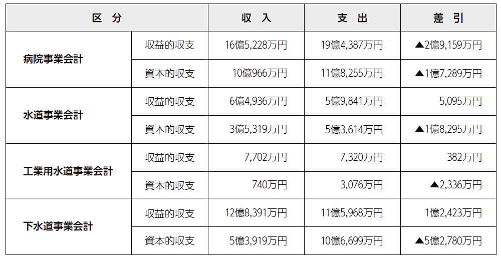 収益的収支(※1)と資本的収支(※2)に加えて、1年間の負債と資産から求められる企業会計の資金不足額・剰余額(実質収支)については、病院事業会計は6億6,215万円、水道事業会計は3,123万円、下水道事業会計は7,116万円の黒字、工業用水道事業会計は0円となりました。