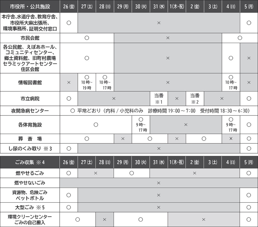 年末年始は次のとおりお休みします。なお休日・祝日当番病・医院は本紙25ページに掲載しています。
