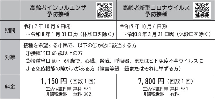 ※2 高齢者インフルエンザ予防接種は非課税世帯の方は無料です。65歳以上の方は医療助成課から送付された以下のいずれかの通知書を受診時に提示してください。