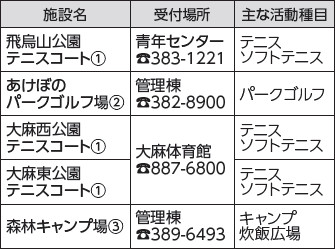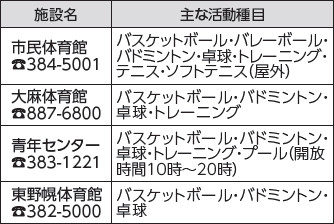 ※時間帯により活動種目を変更することがありますので、詳細は各施設にお問い合わせください