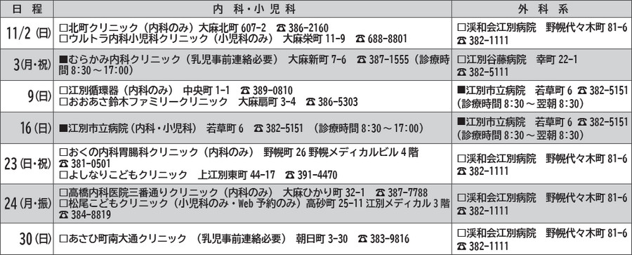 ※都合により変更となる場合があります。詳しくは北海道救急医療情報案内センター(【電話】0120-20-8699、携帯電話からは【電話】011-221-8699)までお問い合わせいただくか、新聞または江別医師会のHPでご確認ください