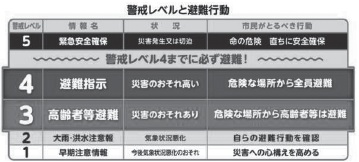 市が発令する避難情報に注意し、避難に時間のかかる方は「警戒レベル3高齢者等避難」、「警戒レベル4避難指示」では危険な場所から全員避難しましょう。