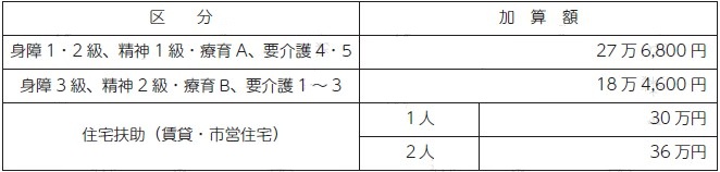 障がい、介護認定を有する方や家賃などを支払っている方は収入基準額に次の加算があります。