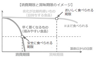 袋や容器を開けない状態で、書かれた保存方法を守って保存した場合においしく食べられる期限。