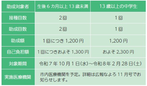 こうした状況への対策として、令和7年度から中学生以下のお子さんを対象に、インフルエンザ予防接種にかかる費用の一部(1,200円)を助成します。