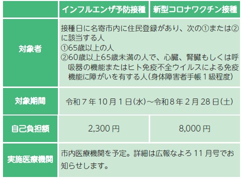 高齢者のインフルエンザ予防接種、新型コロナワクチン接種について、対象者に定期接種を行い、その接種にかかる費用の一部を助成します。