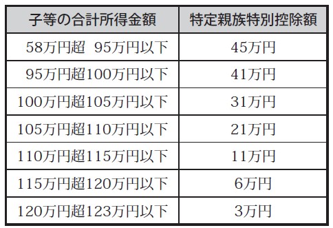 特定親族特別控除が創設され、19歳以上23歳未満で合計所得金額が58万円超123万円以下の親族を有する場合に次のとおり控除が適用されます。