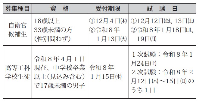 ※詳しくは、自衛隊札幌地方協力本部ホームページでご確認いただくか、お問い合わせください。
