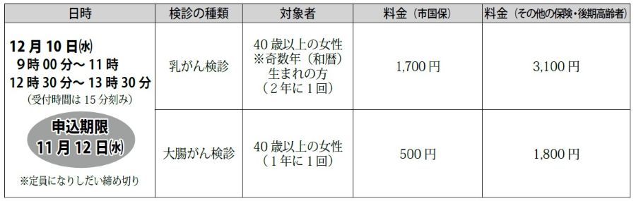 ※このほか市立病院(胃・肺・大腸・子宮・乳がん検診ほか)、神部クリニック(子宮がん検診)、そらち乳腺・肛門外科クリニック(乳がん検診)で受診可能です。医療機関により、料金が異なる場合や別途料金が発生する場合がありますので、各医療機関に直接お問い合わせください。
