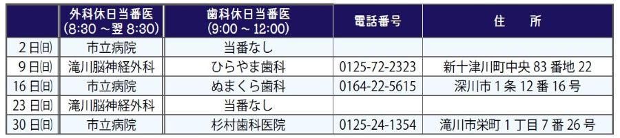 ※市立病院【電話】22-4311/大町2丁目2番34号、滝川脳神経外科【電話】22-0250/西町1丁目2番5号