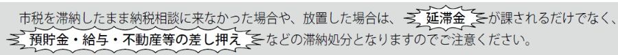失業や営業不振などやむを得ない事情により税金を納期限までに納付することが困難な方、滞納している税金を一括して納付することが困難な方については、税務課納税係(市役所3階2番窓口)にて納税相談を受け付けています。