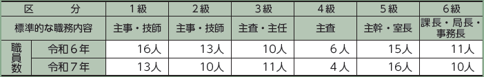 支給額は、この給料表の「級」と「号俸」の組み合わせで決まっており、最も多くの職員に適用されている行政職給料表は1級から6級まであり、一般行政職の級別職員数は表3-3のとおりとなっています。