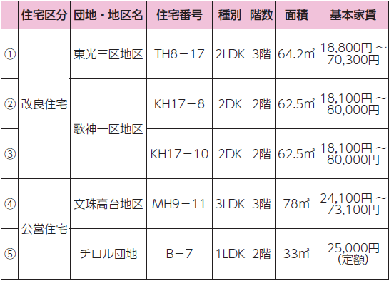 提出書類:入居申込書、入居者全員の本籍記載の住民票、所得証明書、納税(非課税)証明書