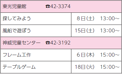 東光児童館・神威児童センターの休館日は、3日(月)、4日(火)、10日(月)、17日(月)、24日(月)、25日(火)です。