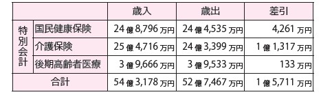 特別会計の歳入総額は54億3,178万円(前年度から5.0%減少)、歳出総額は52億7,467万円(前年度から4.6減少)で、黒字決算となりました。