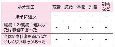 令和6年度は心身の故障による分限処分で2人、その他疾患により1人が休職しています。また、懲戒処分については以下のとおりです。