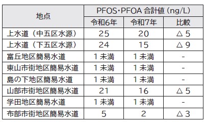 市では水道水の安全性を確認するため、令和5年度から有機フッ素化合物の一つである「PFOS」及び「PFOA」の濃度を検査しています。これまでの測定結果はすべて国が定めた暫定目標値※50ng/L(ナノグラムパーリットル)を下回っています。引き続き水質状況に大きな変化がないか注視してまいります。