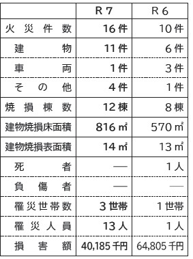令和7年の富良野消防署管轄で16件の火災が発生しました。その内訳は、建物火災が11件、車両火災が1件、その他火災が4件となっておりますが、火災による死傷者はいませんでした。