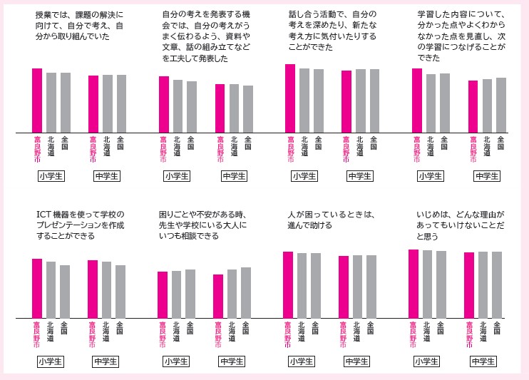 本市では、第1次富良野市教育振興基本計画の基本理念「自立と共生の未来を拓く心豊かでたくましい人を育む」のもと、教育の原点である知・徳・体の調和のとれた子どもたちの着実な育成を基本に「すべては子どもたちのために」を合い言葉に、子どもたちの無限の可能性を伸ばす教育の充実に努めてきました。今回の調査結果を受け、今後も、これまでの取組の成果を生かしつつ、児童生徒の確かな学びの定着に向けて着実な取組を継続するとともに、学校・家庭・地域が連携し学力向上に努めていきます。