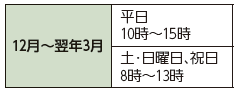 ・12月1日(月)~5日(金)、8日(月)~12日(金)、15日(月)各日7時~21時