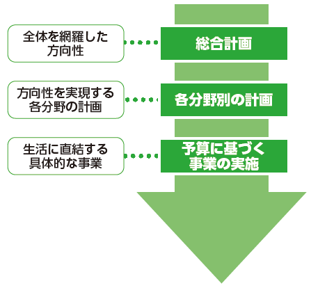 そのため、市が行うすべての分野(都市計画、福祉、教育など)を網羅した計画となっています。