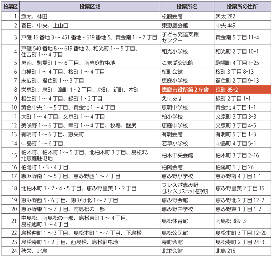 ・第8投票所は「恵庭市民会館」➡「恵庭市役所第2庁舎」に変更となっています。