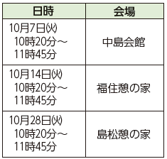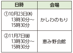 日時:(1)11月5日(水) (2)11月12日(水) 各日9時30分~11時40分