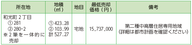 その他:入札日時は申込者に別途通知します。売却物件の内容は変更となる場合がありますので、詳しくは市ホームページで確認、もしくは問い合せください