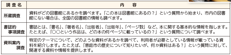 本探しのプロである図書館司書が、以下のことについて調べてくれます。レファレンスサービスは本館・分館どちらでも利用可能で、市内にはない本を市外の図書館から取り寄せることもできます。