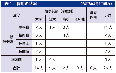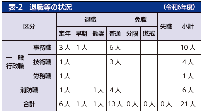 令和7年4月1日の採用者数は26人。その内訳は表1のとおりです。募集する職種や採用者数は、退職者の状況により毎年異なります。また、令和6年度中に退職した職員数は21人で、その内訳は表2のとおりです。