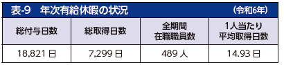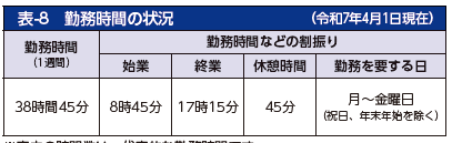 職員の勤務時間や休暇などに関しては、市の条例・規則で定められています。職員の勤務時間や年次有給休暇の取得状況は表8、表9のとおりです。