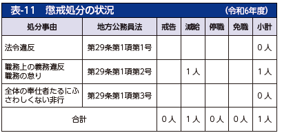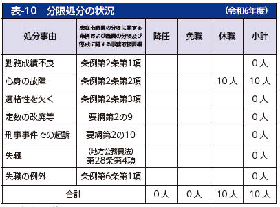 分限処分は、心身の故障などのために職員が職務を十分に果たすことのできない場合に、公務の効率的な運営を確保することを目的として行う処分(降任・免職・休職・降給)をいいます。また、懲戒処分は、公務員の秩序を維持する為の職員の義務違反に対する制裁措置(戒告・減給・停職・免職)をいいます。分限処分および懲戒処分の状況は表10、表11のとおりです。