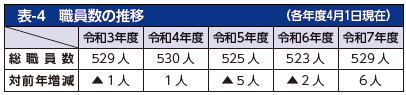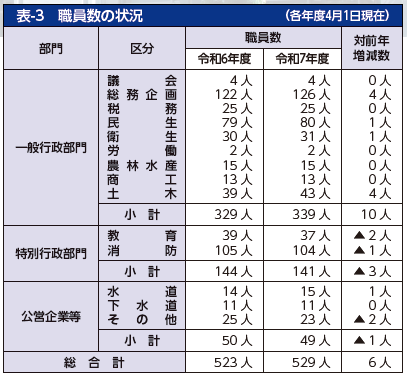 職員定数は、常勤職員を任用できる限度として、市議会の議決を経て条例で定められています。職員数の状況は表3のとおりです。