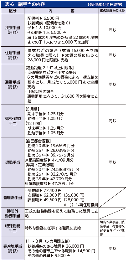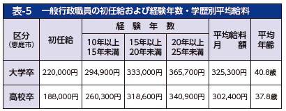職員の給与は、基本給(給料)と扶養手当、住居手当、期末・勤勉手当などの諸手当から成り立っており、市議会の議決を経て定められています。初任給の状況および一般行政職員の経験年数・学歴別平均給料月額の状況は表5、諸手当の内容は表6となっています。